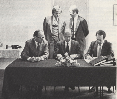 "Kaupallisen käytön sopimus": Tilaajana toimineen TVO:n ja laitostoimittaja Asea-Atomin edustajat allekirjoittivat asiakirjat, joiden mukaan TVO I:n käyttövastuu siirtyy TVO:lle runsaan vuoden kestäneen koekäytön jälkeen. Sopimuksen allekirjoittivat Asea-Atomin toimitusjohtaja Lars Helle (pöydän ääressä keskimmäisenä) sekä TVO:n toimitusjohtaja Magnus von Bonsdorff (vas.) ja projektiosaston johtaja Esko Haapala. Taustalla allekirjoitusta seuraavat molempien yhtiöiden lakimiehet Lars Gunnar Flemströn (vas.) ja Risto Roto. (Kuva TVO:n arkisto)
