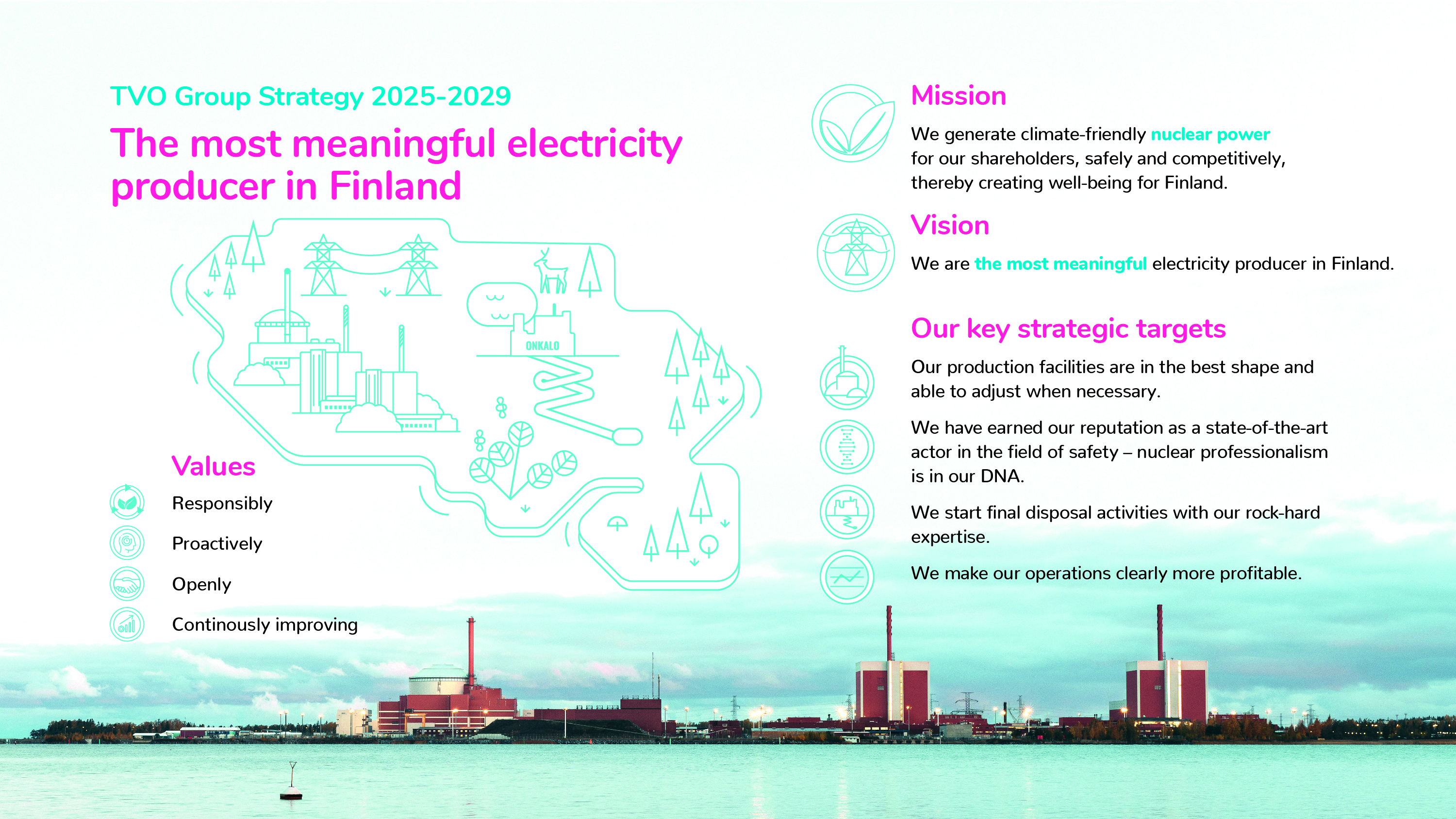 TVO Group’s strategy for 2025–2029 focuses on safe, competitive and predictable electricity production. The strategy supports the vision of becoming Finland’s most significant electricity producer and ensures that nuclear power continues to provide well‑being for Finland responsibly and in an environmentally friendly manner.