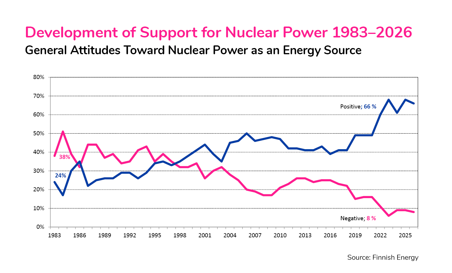 Support for nuclear power has remained strong in Finland for several years. Over the longer term, however, the shift has been significant. When the survey was first conducted in 1983, nearly 40% of Finns viewed nuclear power negatively, while only one in four had a positive opinion.
