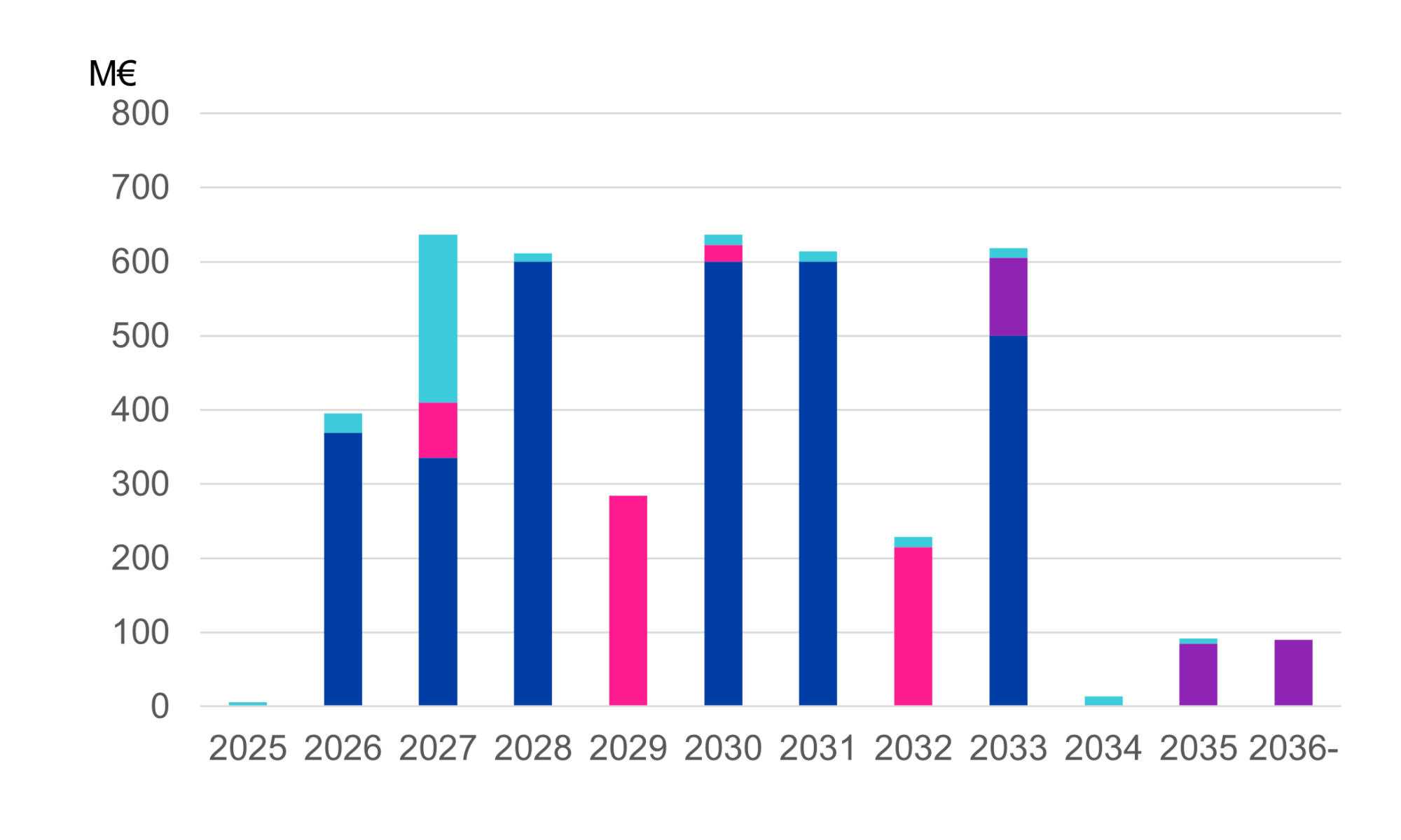 | Vuosi | 2025 | 2026 | 2027 | 2028 | 2029 | 2030 | 2031 | 2032 | 2033 | 2034 | 2035 | 2036- | Yhteensä |