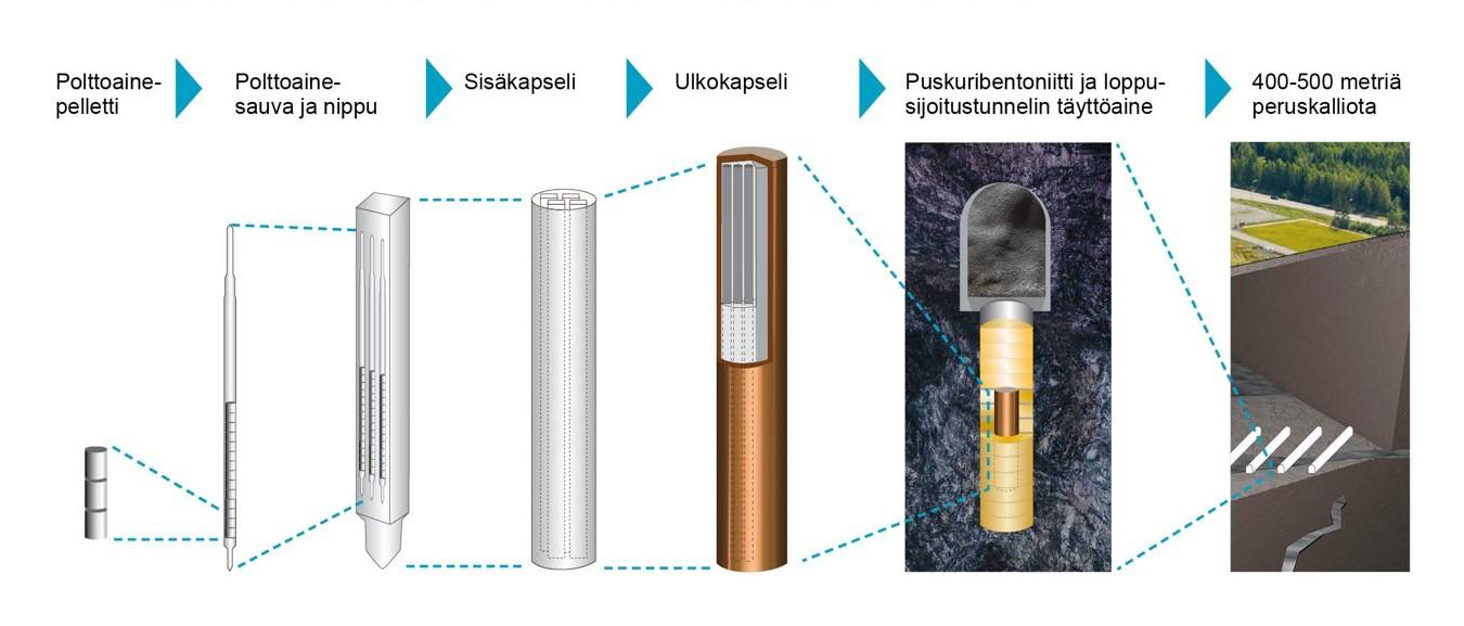 Pitkän välivarastointijakson jälkeen polttoaineniput suljetaan kuparista ja valuraudasta valmistettuihin kapselointisäiliöihin. Loppusijoitus tapahtuu yli 400 metrin syvyydessä kallioperässä, missä kapselit suojataan bentoniittisavella. Tämä moniesteperiaate varmistaa radioaktiivisten aineiden eristyksen ympäristöstä.