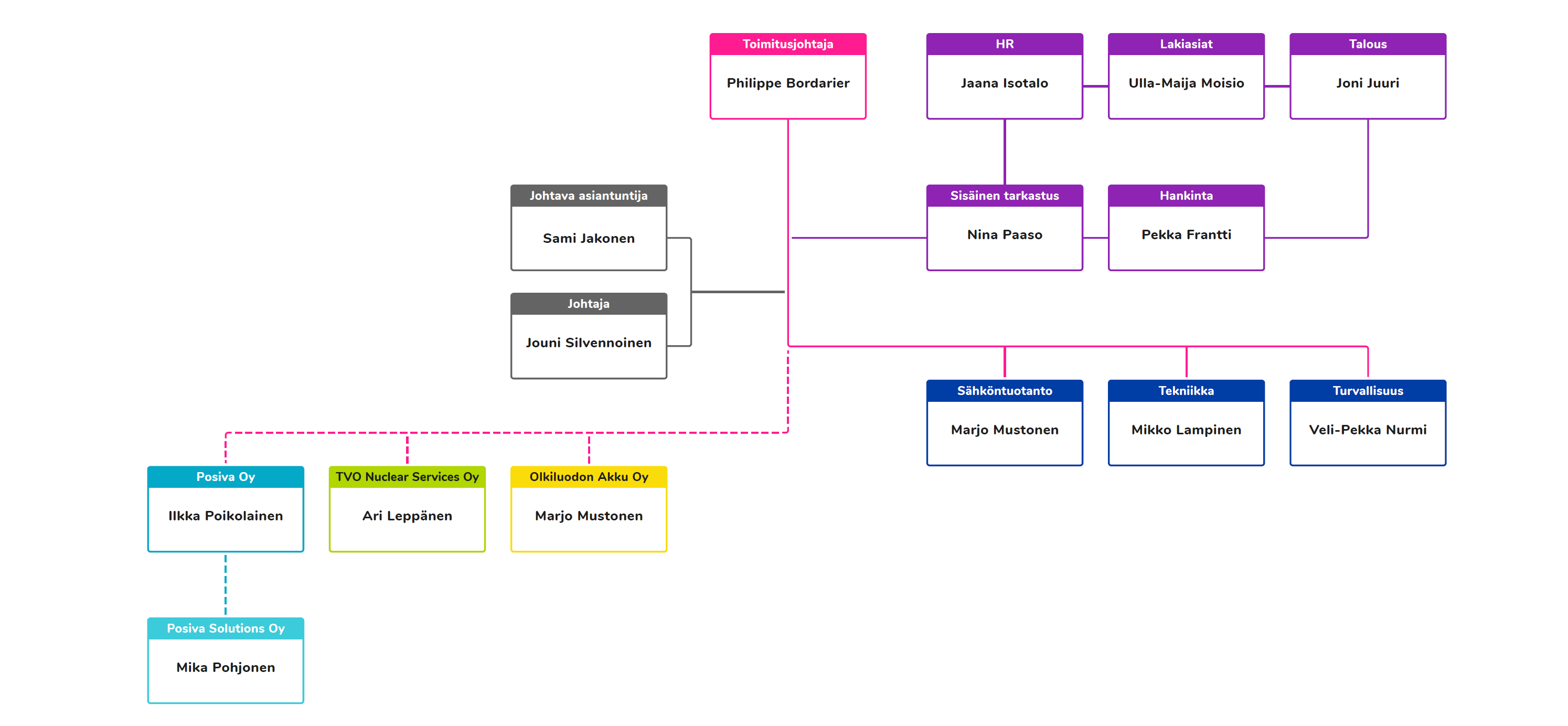 TVO‑konsernin organisaatio rakentuu vahvan ydintoiminnan ja sitä tukevien asiantuntijapalvelujen ympärille. Ydinvoiman tuotantoa täydentävät monipuoliset tukipalvelut sekä Posivan ainutlaatuinen osaaminen ydinpolttoaineen loppusijoituksessa. Turvallisuus läpileikkaa kaikkea toimintaamme ja ohjaa niin arjen päätöksiä kuin pitkäjänteistä kehittämistä.